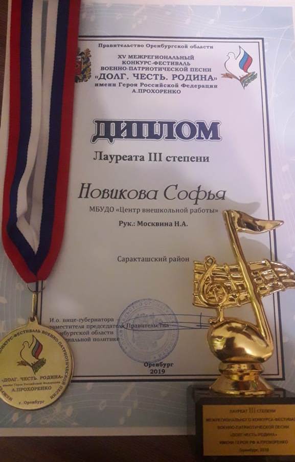 Итогом конкурсной программы стал гала-концерт с награждением победителей, среди которых Софья Новикова – лауреат III степени - солистка образцового детского коллектива «Овация» Центра внешкольной работы Саракташского района. Руководитель коллектива Москвина Наталья Александровна. Исполняя произведение «Взмахни крылами Русь» Вячеслава Тюльканова, Софья удивила зрителей сильным голосом и ярким выступлением, не смотря на свой юный возраст. Мы гордимся нашей юной и талантливой вокалисткой! Больших творческих успехов и новых побед! Поздравляем!